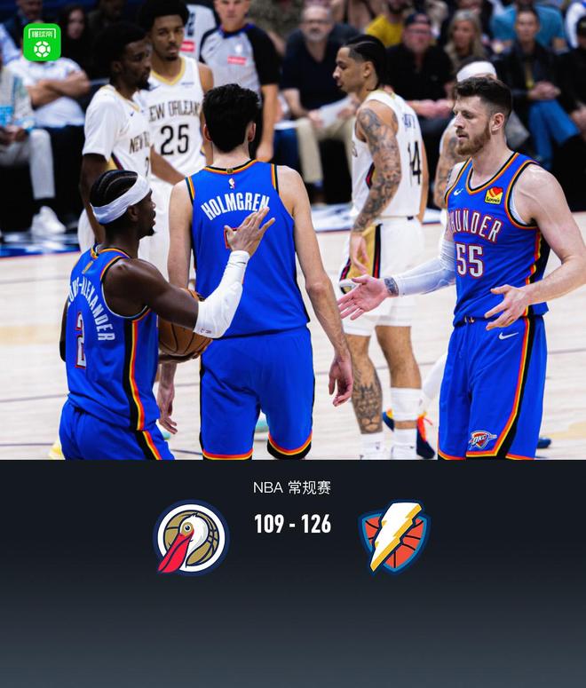 北京时间11月18日,NBA常规赛新奥尔良鹈鹕队对阵俄克拉荷马城雷霆队。半场结束鹈鹕56-69领先雷霆,最终鹈鹕109-126领先雷霆。新奥尔良鹈鹕队菲尔斯得到24分、1个篮板和1次助攻,特雷·墨菲得到18分、5个篮板和1次助攻。俄克拉荷马城雷霆队的霍姆格伦得到26分和9个篮板,亚历山大得到23分、2个篮板和8次助攻。鹈鹕队第一节米卡·皮维得到7分,雷霆队多特得到12分。首节结束,鹈鹕24-49领先雷霆。第二节,鹈鹕队的特雷·墨菲得到11分,雷霆队的阿贾伊·米切尔得到7分。半场结束,鹈鹕56-69领先雷霆。第三节,鹈鹕队的伊夫·米西拿下4分,雷霆队的亚历山大拿下11分。第三节结束,鹈鹕领先雷霆80-105。第四节鹈鹕队以80-105领先。菲尔斯得到10分,雷霆队的以赛亚·乔得到5分。最终,鹈鹕队以109-126不敌雷霆队。新奥尔良鹈鹕队全场数据:菲尔斯拿下24分1篮板1助攻;特雷·墨菲拿下18分、5个篮板、1次助攻和3次抢断。米卡·皮维得到16分、4个篮板和4次助攻。俄克拉荷马城雷霆队的霍姆格伦得到26分、9个篮板和1次盖帽。亚历山大拿下23分、2个篮板、8次助攻和3次抢断。多尔特得到17分1篮板1助攻1抢断1盖帽。新奥尔良鹈鹕队首发阵容:菲尔斯、特雷·墨菲、德里克·奎因、伊芙·米西、赫伯特·琼斯。俄克拉荷马城雷霆队:霍姆格伦、亚历山大、多尔特、哈滕斯坦、卡森华莱士。